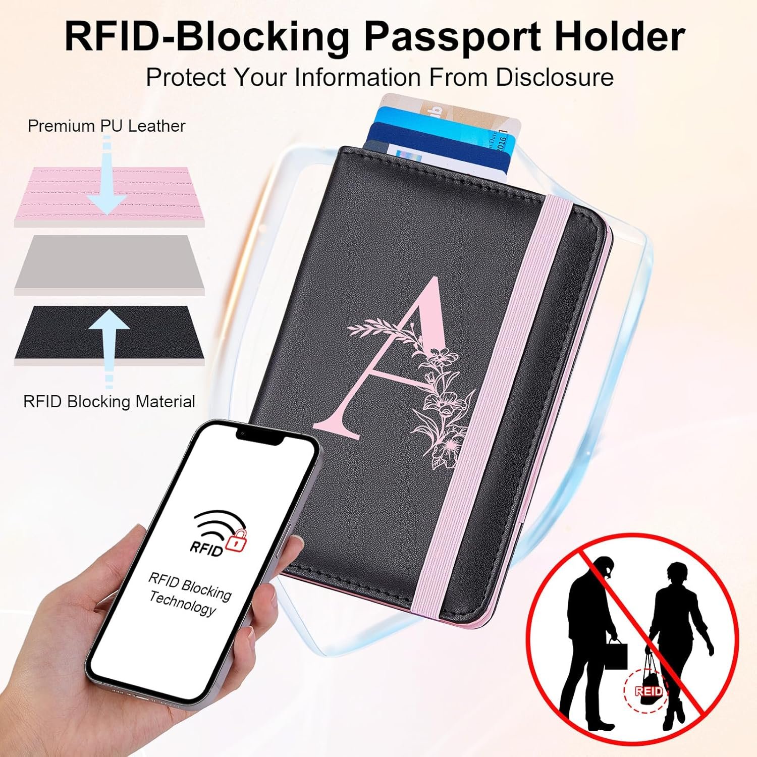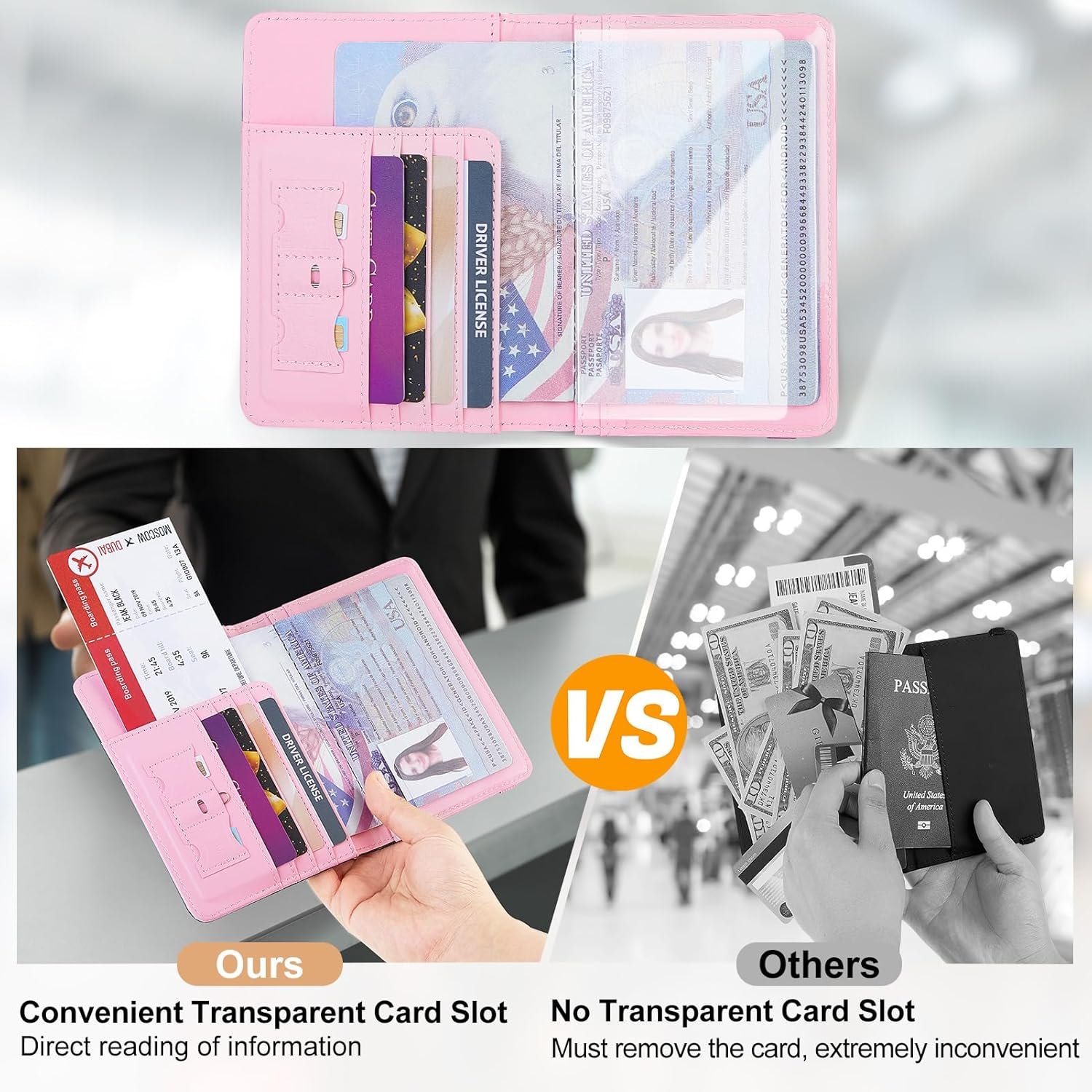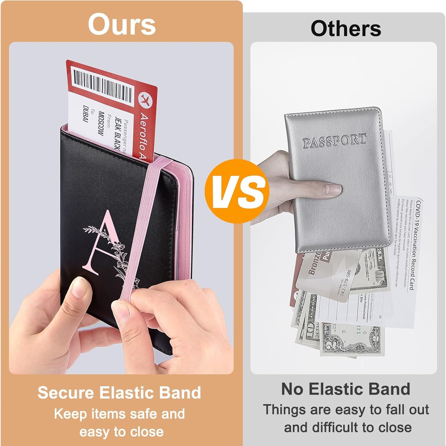 RFID Security Passport Protector: Our passport holder is made with RFID-blocking material to keep your information safe from id theft; This RFID passport holder also has an elastic strap that holds everything securely when closed, so your important documents and cards won’t fall out when you’re in a rush during travel