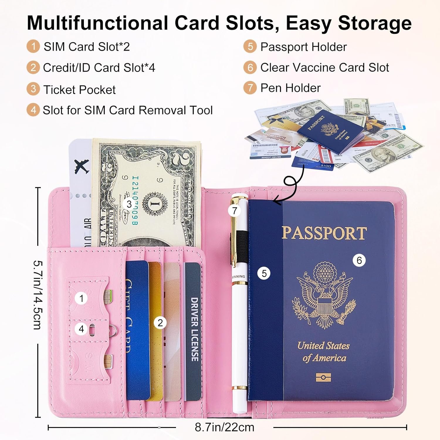 Multifunctional Design: This passport book holder features 1 passport pocket, 1 transparent vaccine card slot, 4 card slots for your credit cards, ID card, driver’s lisence, 1 ticket pocket for your air tickets,1 pen holder; 2 SIM card slots and 1 slot for a SIM card removal tool; Easy to View: the clear window pocket allows you to display your vaccine card or ID card easily without taking it out