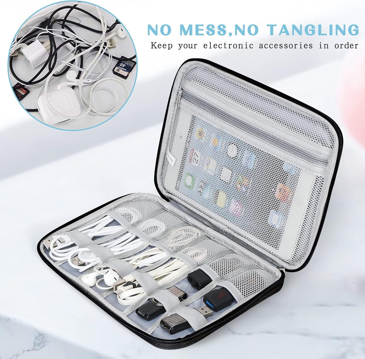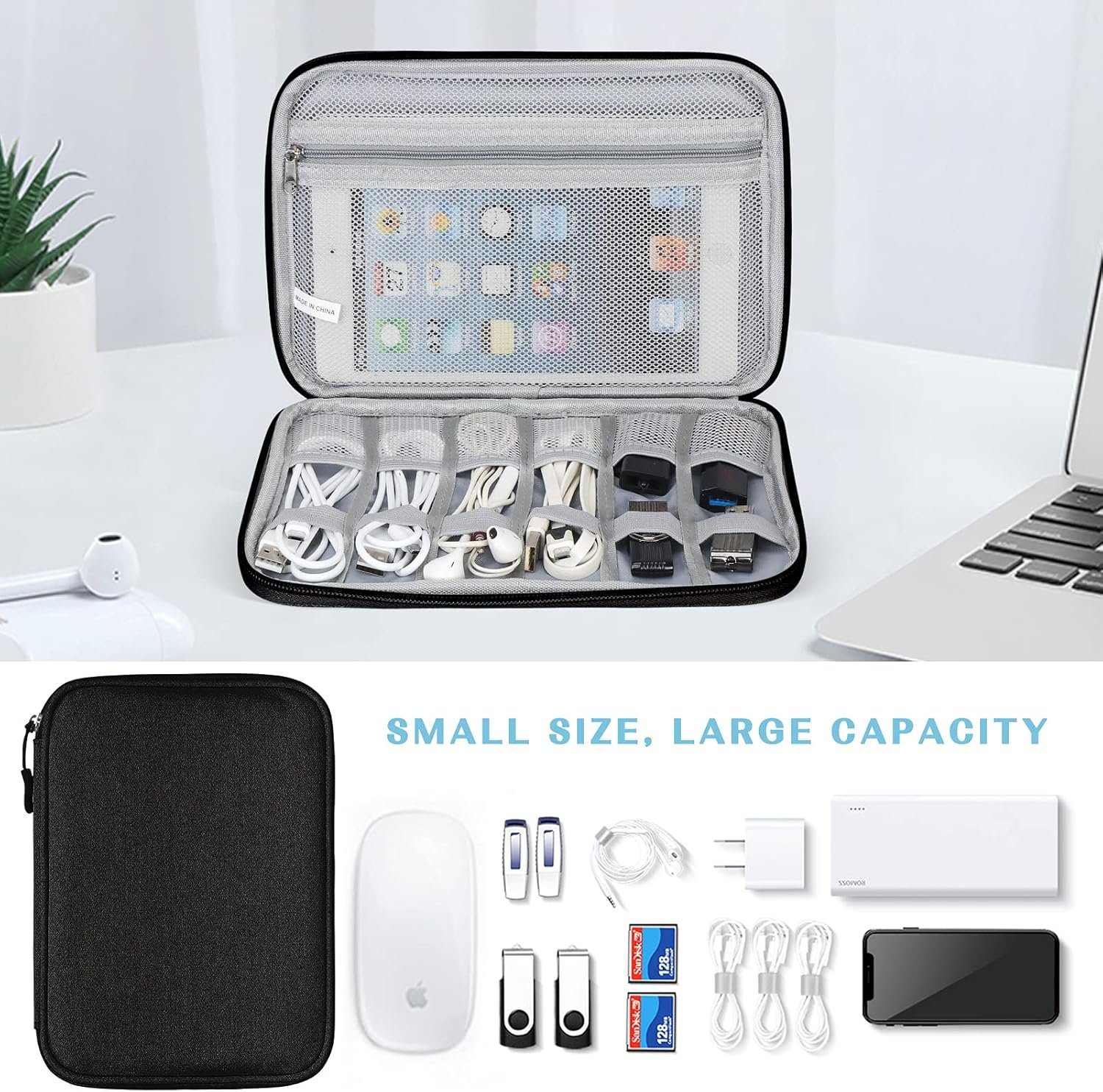Large Capacity: The electronics storage bag has enough space to take in your cords, cables, USB drive, cellphone, charger, mouse, flash drive, and other accessories.