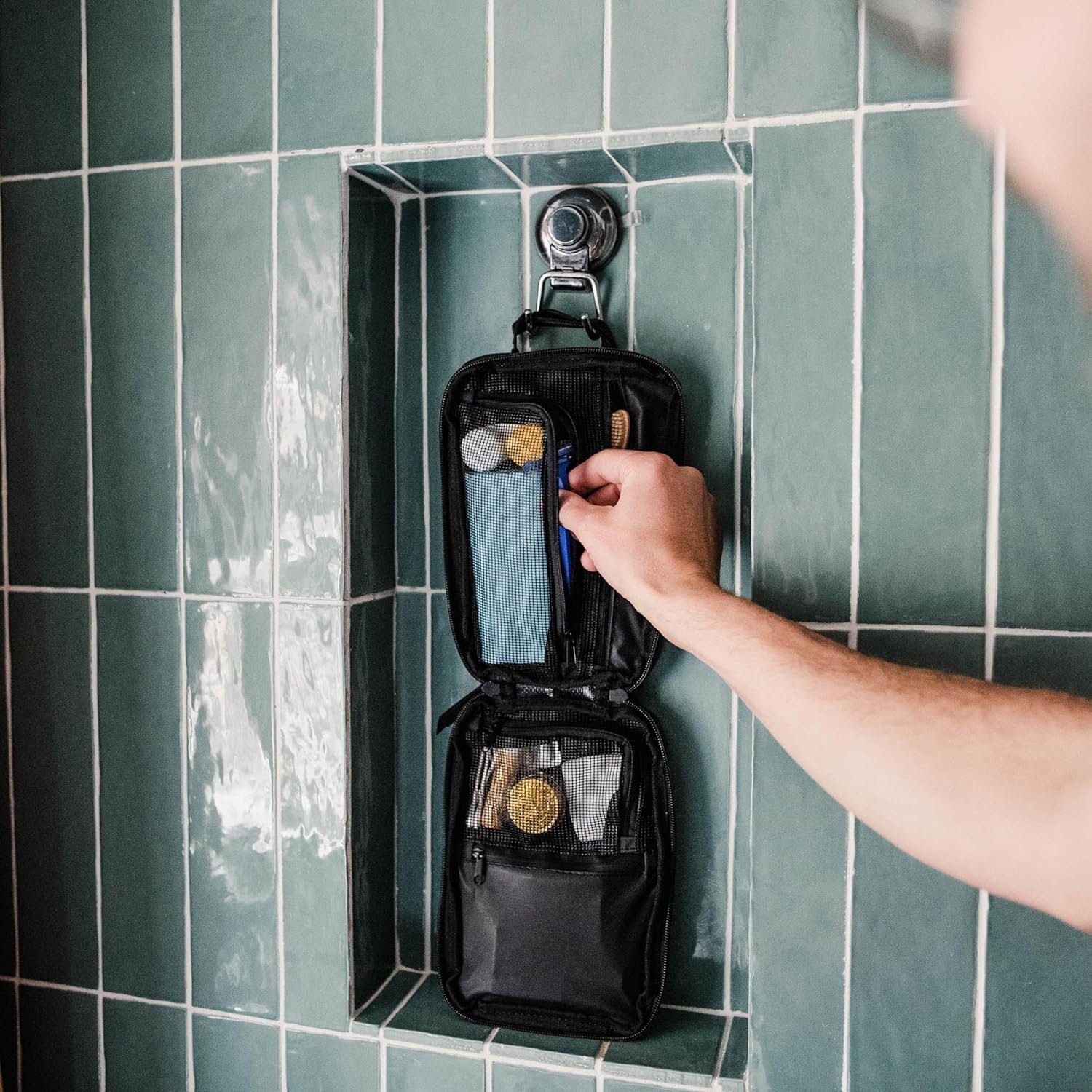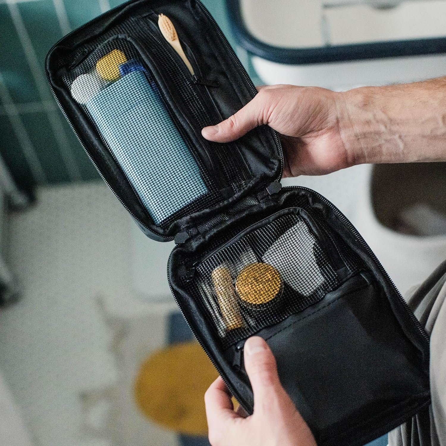 A pouch that hygienically stores essential bath accessories (shampoo, shave, cosmetics, etc.)