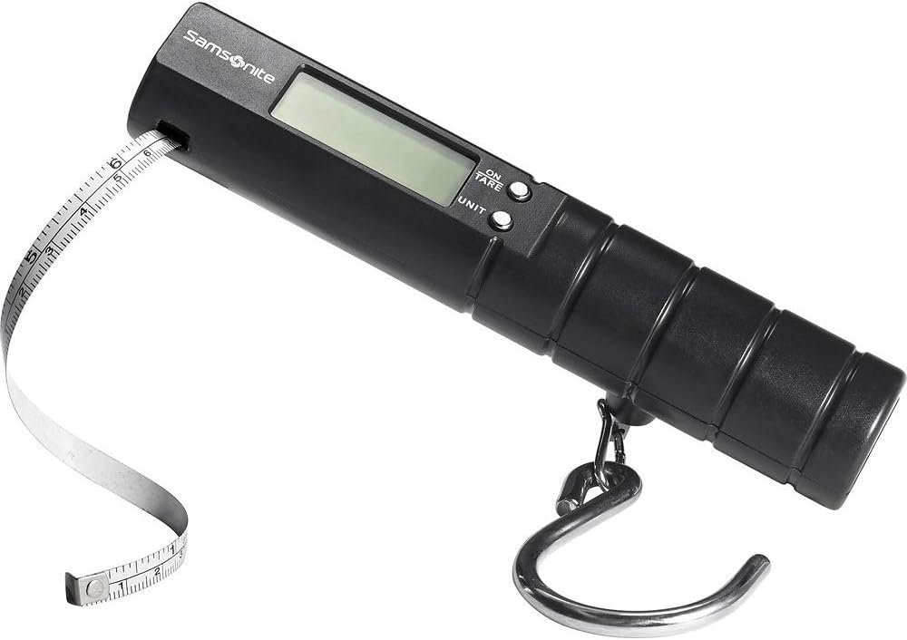 Compact and portable luggage scale registers up to 80 lbs.
