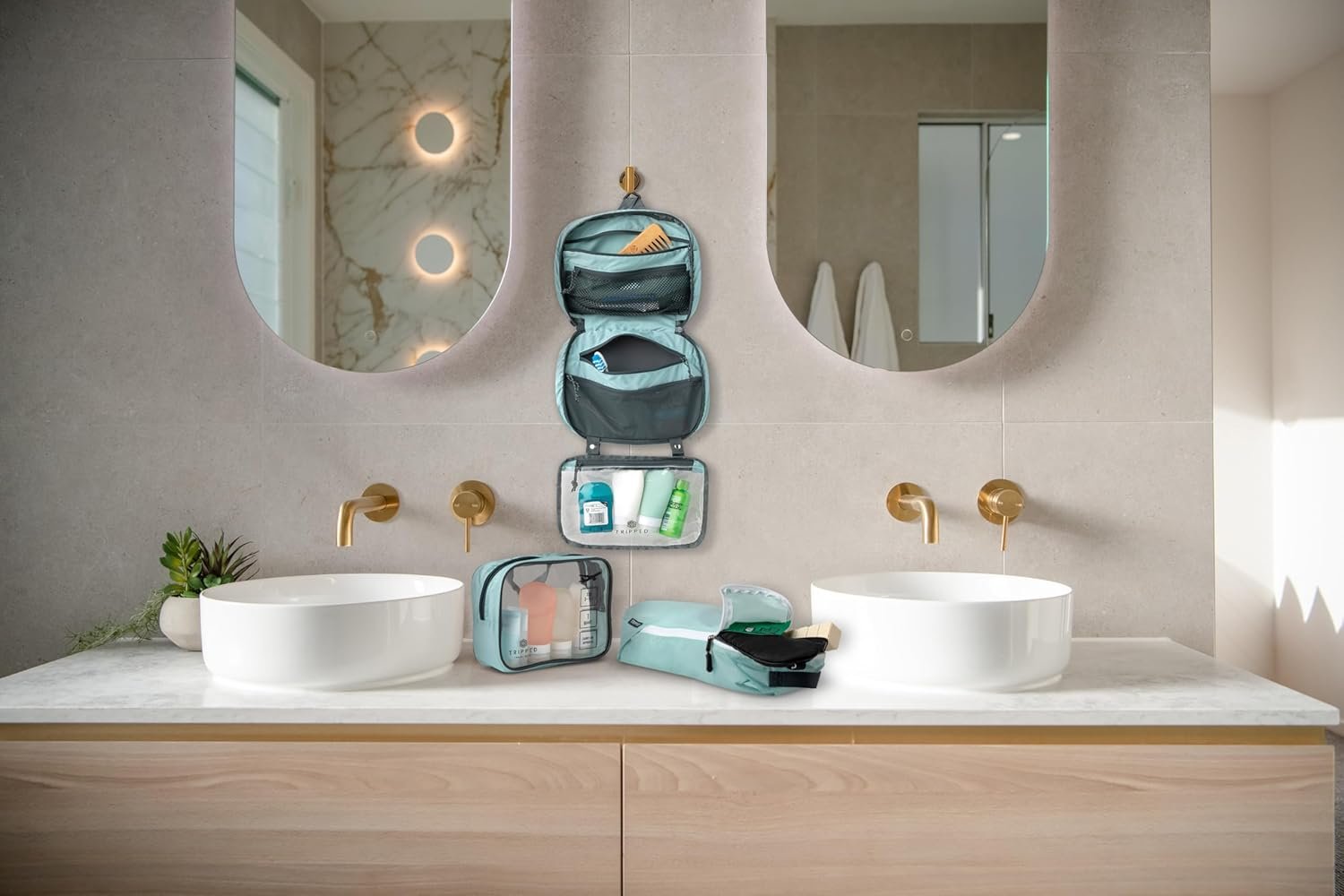 Toiletry set hanging in a bathroom with a 311 liquids bagToiletry set hanging in a bathroom with a 311 liquids bag