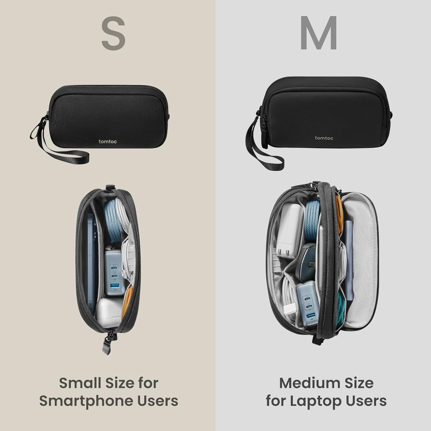 Convenient & Portable: Designed for portability, the tomtoc tech and travel pouch keep your essentials organized and within reach, fitting seamlessly into a backpack, tote, or handbag, and can stand upright on a desk to grab items easily