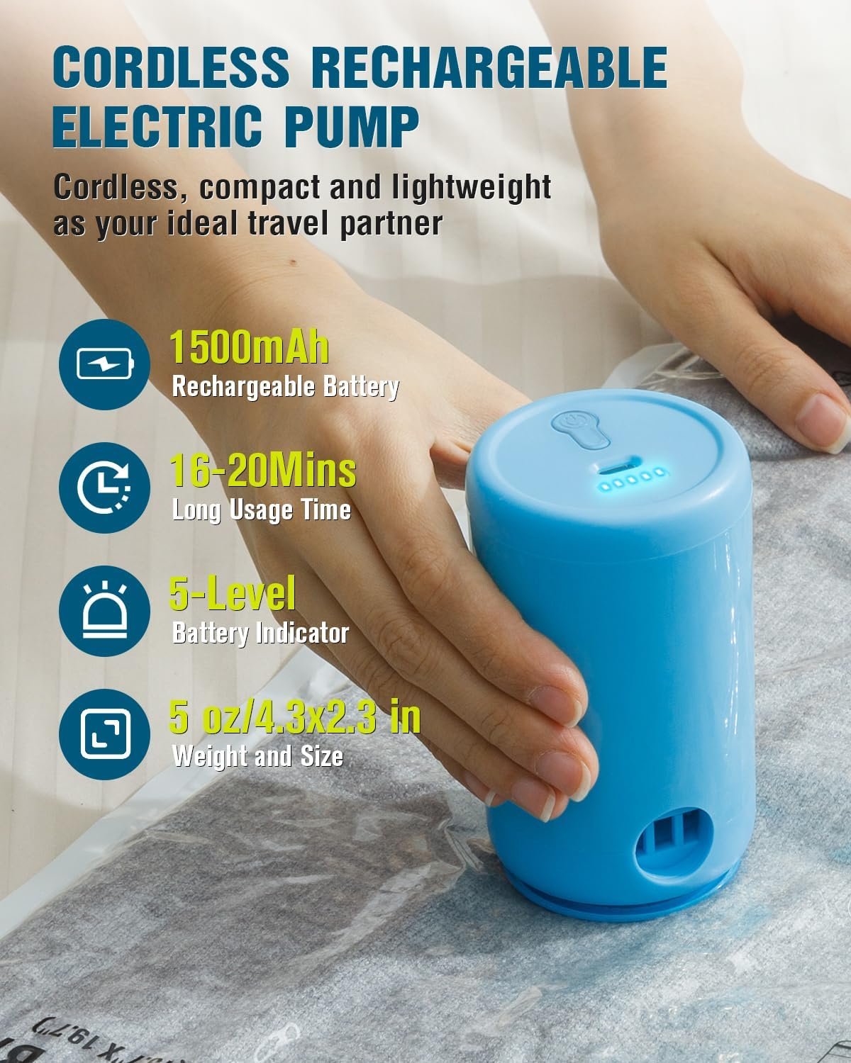【Designed For Travel】Our vacuum storage bags are designed to fit perfectly to your luggage, travel bags and backpacks. They are the best way to make your clothes flatter and more packable, especially when traveling in winter taking bulky clothes, they are able to help you save up to 80% extra space in your luggage or suitcase, also they can keep all of your travelling itmes neat and well organized. And they comes with an cordless rechargeable electric pump, which is very compact and light for you to take it anywhere to use